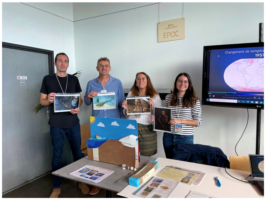 Les visiteurs ont pu découvrir la paléoclimatologie et discuter du changement climatique à travers plusieurs ateliers mettant en avant l’étude des carottes sédimentaires marines et de leurs proxies, de même que la modélisation du climat. Plus spécifiquement, le stand tenu par les membres de l’équipe PALEO, regroupant Ludovic Devaux, Thomas Extier, Tiffanie Fourcade et Coralie Zorzi, consistait en : (1) une frise chronologique présentant les événements majeurs depuis le Big Bang jusqu’à l’actuel ramenée à l’échelle d’une année pour sensibiliser le public à la notion d’âge géologique ; (2) une maquette du système Terre présentant les composantes de la machine climatique. Celle-ci était utilisée pour introduire la notion d’archive climatique et des processus de rétroaction climatique ; (3) une carotte de sédiments et ses éléments microfossiles et détritiques (foraminifères, IRD et grains de pollen en pâte) ; (4) un exercice d’identification d’assemblages de microfossiles avec l’aide d’un atlas pour reconstruire les variations océaniques et terrestres (et donc climatiques) au cours de quatre périodes de temps ; (5) une sensibilisation au changement de la température moyenne depuis 1800 jusqu’à 2100 à partir d’une simulation climatique ; (6) une introduction aux modèles de climat avec l’utilisation du logiciel pédagogique SimClimat ; (7) une grille de mots fléchés (à emporter ou faire sur place) synthétisant les notions présentées dans les autres ateliers.