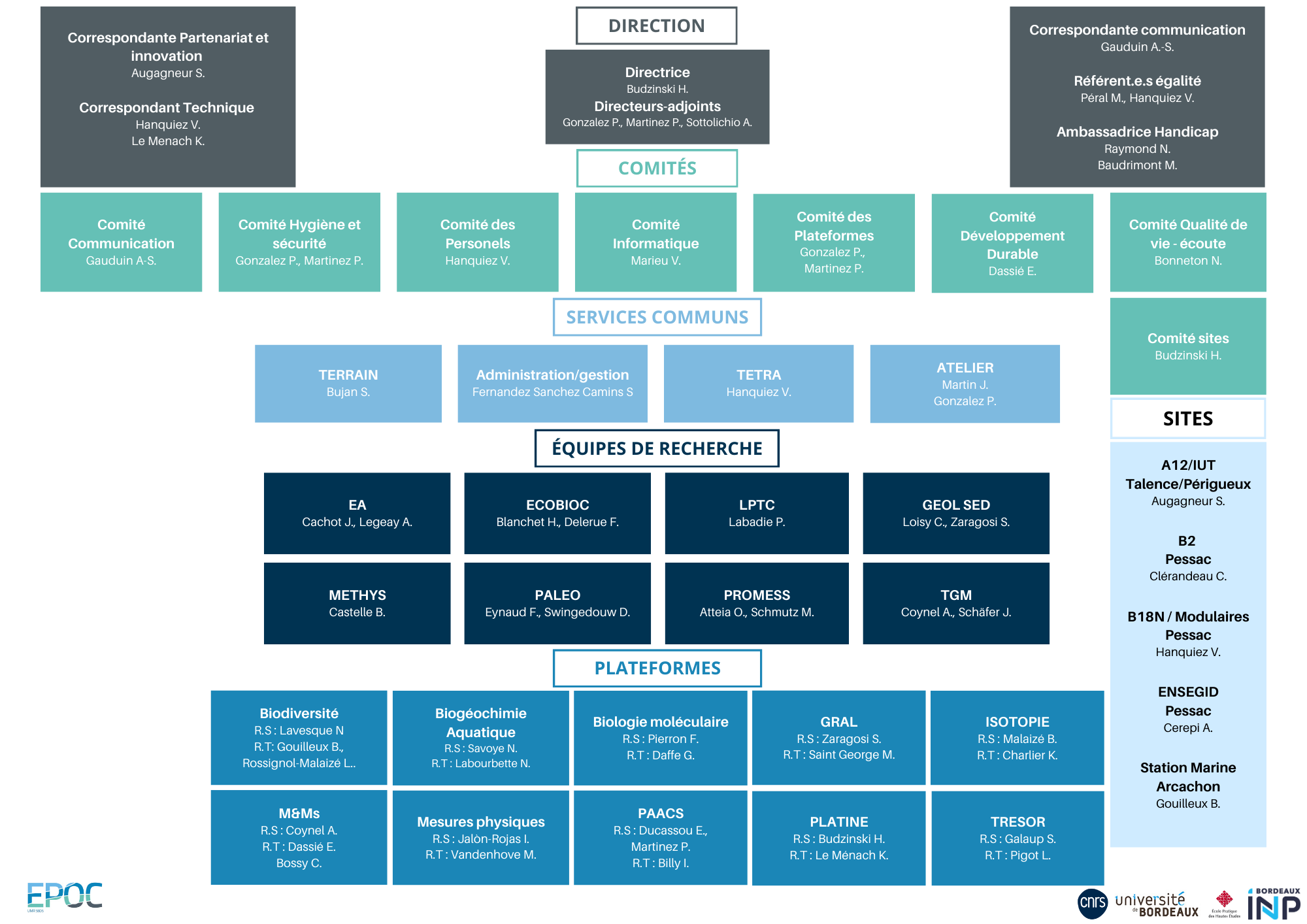 Les recherches conduites à l’UMR EPOC se déclinent en trois grandes thématiques : Ecotoxicologie et Chimie de l’environnement, Océanographie côtière et Géosciences, au sein desquelles se répartissent les 8 équipes de recherche. Ces équipes rassemblent des chercheurs, enseignants-chercheurs et personnels techniques dans les domaines de l’écotoxicologie, de la chimie de l’environnement, de l’écologie, de la physique du littoral, de l’océanographie côtière, de l’hydrogéologie, de la sédimentologie et de la paléoclimatologie. Les recherches développées au sein de ces équipes s’appuient sur 10 plateformes techniques de recherche et 4 services communs. L’organisation et la gouvernance de l’UMR EPOC s’appuient sur différents comités, référents et correspondants.