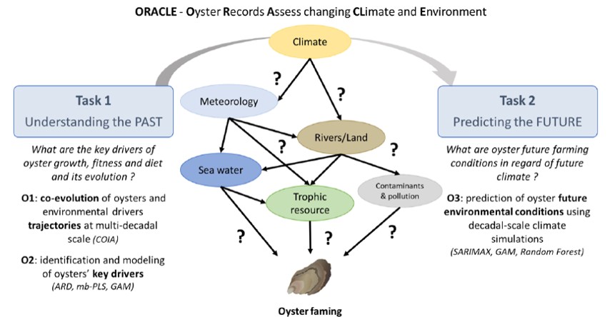Global change affects coastal ecosystems services and impact socio-economical activities. As Europe’s leading oyster producer, the Nouvelle-Aquitaine region face critical challenges from climate change and environmental stressors. Leveraging a multi-decadal array of climatic, biogeochemical and ecological data in advanced numerical and statistical analyses, this project proposes an innovative approach to unravel the complex interactions between oysters and their changing environment. The ORACLE project aims 1) to retrospectively study ecosystems trajectories and pinpoint key drivers of oyster growth, fitness and diet, and 2) to forecast future conditions of oyster farming using cutting-edge decadal climate predictions. The outcome of the project seeks to guide sustainable practices to enhance the resilience of the oyster farming to the challenges of a rapidly changing climate.